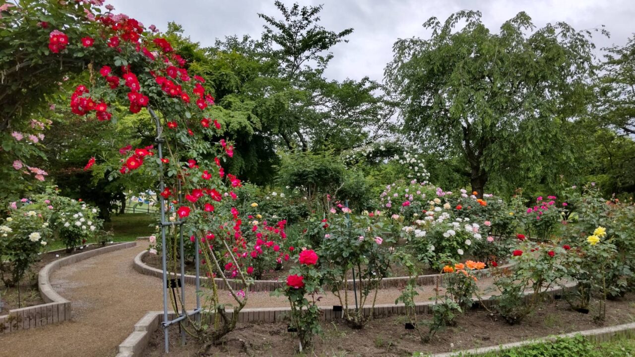 八戸公園では2025年6月12日現在、春バラが見頃を迎えており、園内の「ローズガーデン」「カナール広場」「花木園」の3箇所で、約1,000本の色とりどりのバラが咲き誇っています。